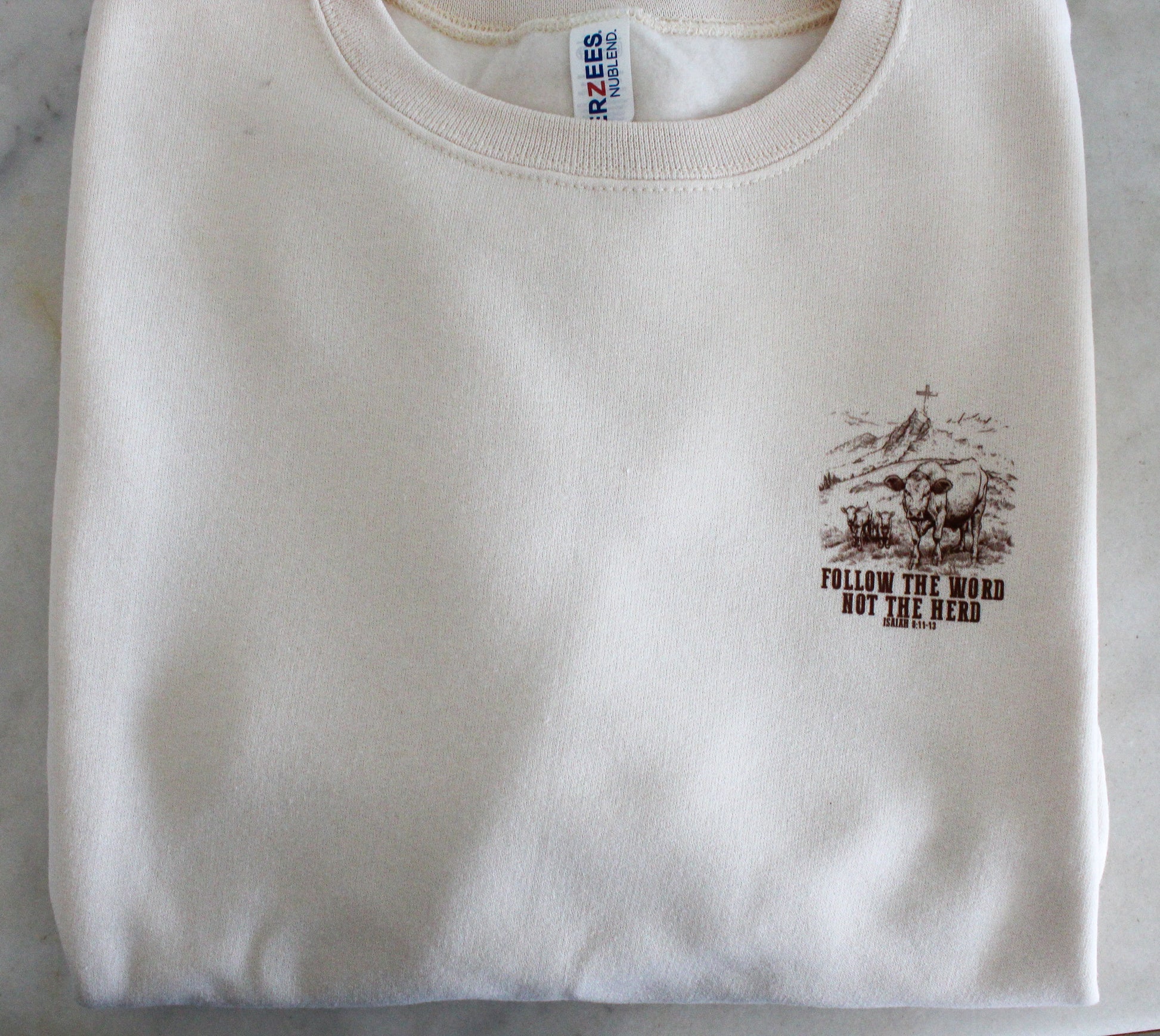 Our “Follow the Word, Not the Herd” sweatshirt combines rustic Western artwork with a timeless message of faith. Featuring detailed cattle and mountain art with a cross rising above, this cozy fleece crewneck is perfect for cooler days. Printed with the reminder of Isaiah 8:11-13, it’s more than just a sweatshirt—it’s a bold statement of where your heart follows.