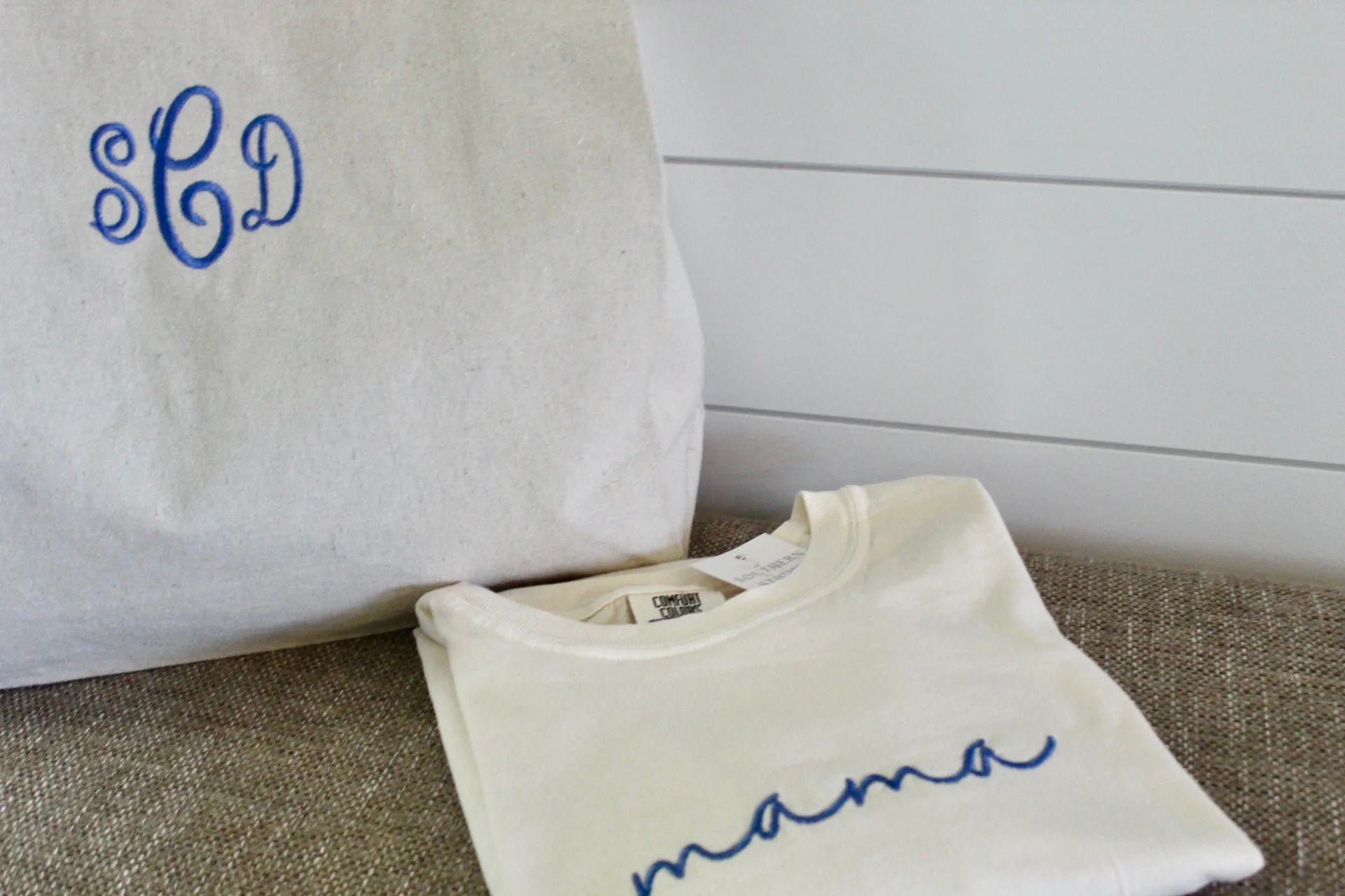 This exclusive gift bundle includes a super-soft Comfort Colors “Mama” T-shirt and a coordinating monogrammed tote — both customized with the thread color of your choice for a coordinated, personal touch.
