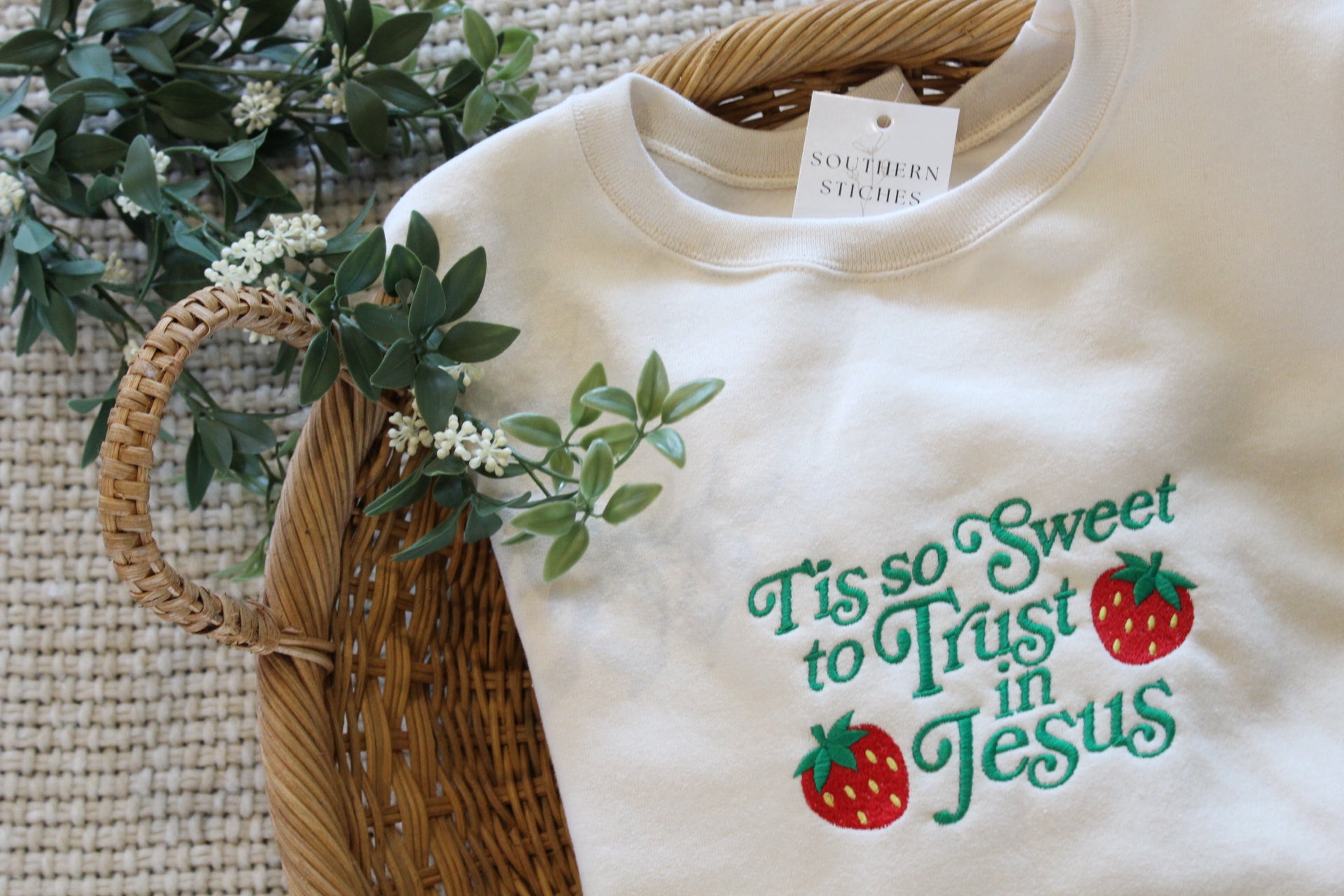 Embrace comfort and faith with this beautifully embroidered crewneck sweatshirt, featuring delicate strawberries and the uplifting message, 'Tis So Sweet to Trust in Jesus. Crafted with care, this cozy piece adds a touch of sweetness to your everyday wardrobe, blending timeless style with a heartfelt reminder of trust and love.