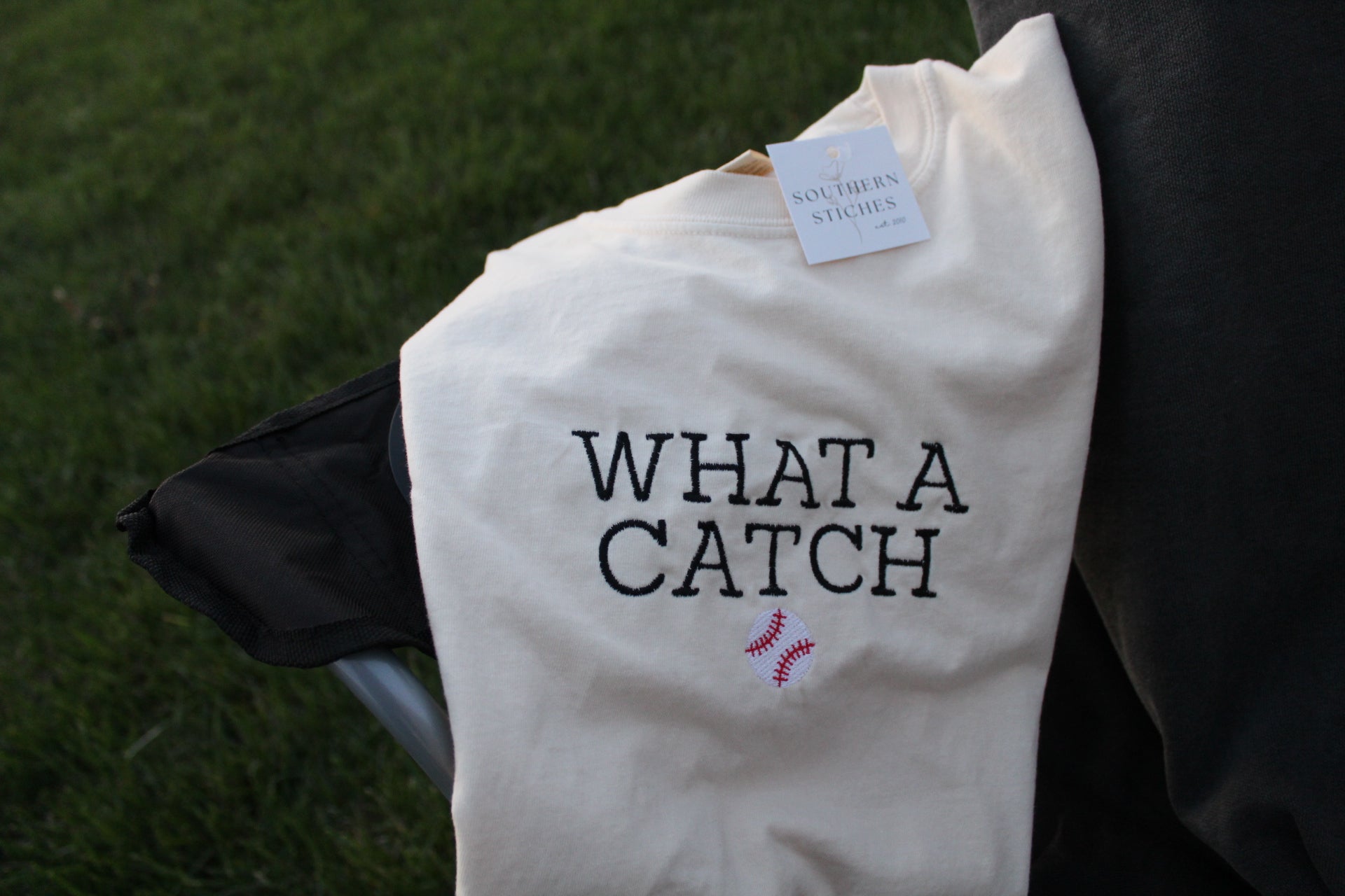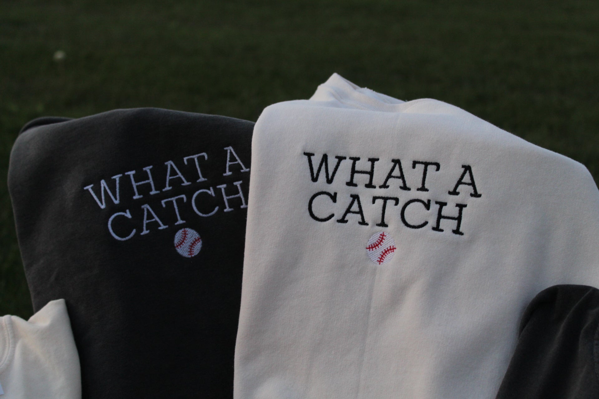 Show off your love for the game with this stylish 'What a Catch' embroidered crewneck sweatshirt. Featuring a bold, eye-catching design, the shirt proudly displays the phrase 'What a Catch' in vibrant stitching, complemented by a detailed baseball graphic.